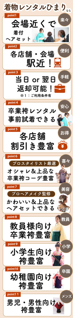 卒業式袴レンタルなら、HIMARIで決まり!HIMARIの袴レンタルは、必要な小物や卒業式当日のお仕度も全てセットの安心プランが目白押し!高級着物やオリジナル着物まで、スタイリストこだわりの特別な卒業式袴をご用意しております。ちょっと差をつけたい特別な日に、お気に入りの1枚で楽しんで♪